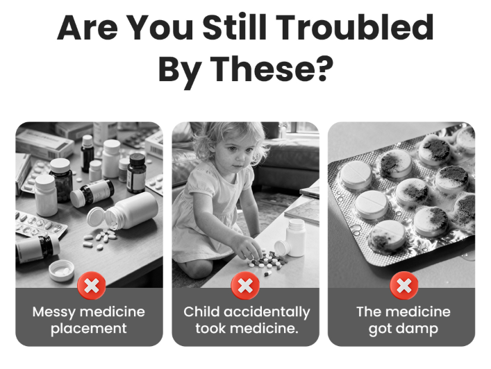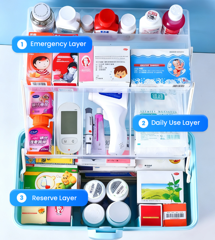סיווג לשלושה מדפים: מאורגן בחוכמה לשלושה מדפים לגישה קלה. המדף העליון מיועד לפריטים לשעת חירום, המדף האמצעי לתרופות לשימוש יומיומי והמדף התחתון לתרופות רזרביות. לא עוד חיפושים נואשים במצבי חירום – לכל דבר יש את מקומו.